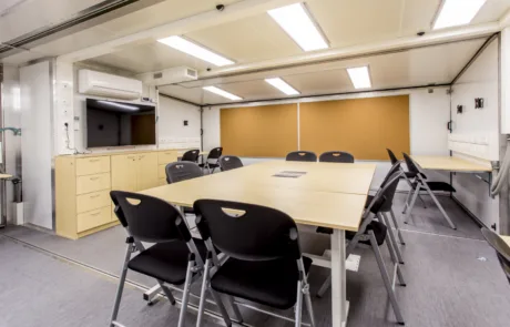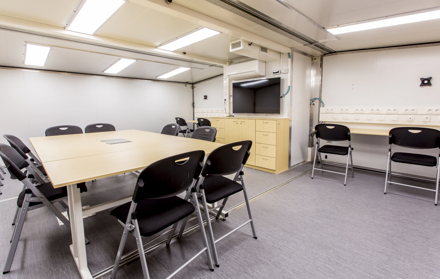 The Command Center provides the means to work in crisis situations around the clock. It has up to 16 workstations, each equipped with the necessary technology and tools according to the workers’ needs and roles. Each container can have up to four different network levels, all pre-installed for the operator to plug and play.