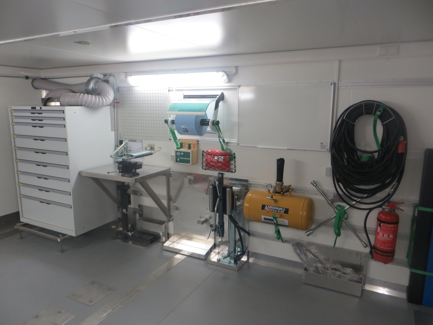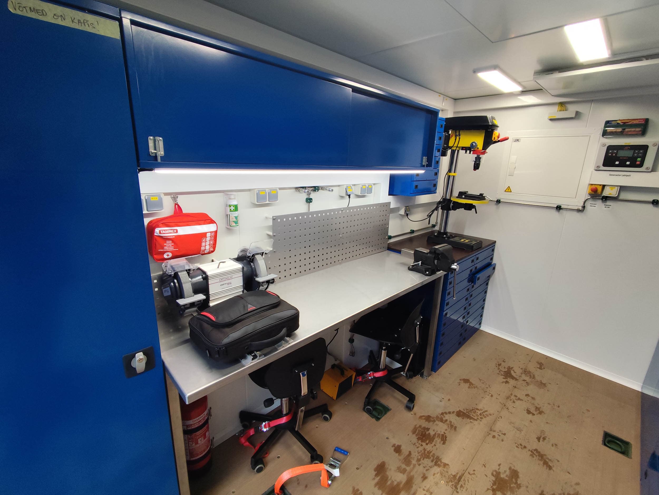 Equipment: 10 kW generator, Air conditioning, Electrical and diesel heating, Tools, Workbench, Drill bench, Pneumatic system