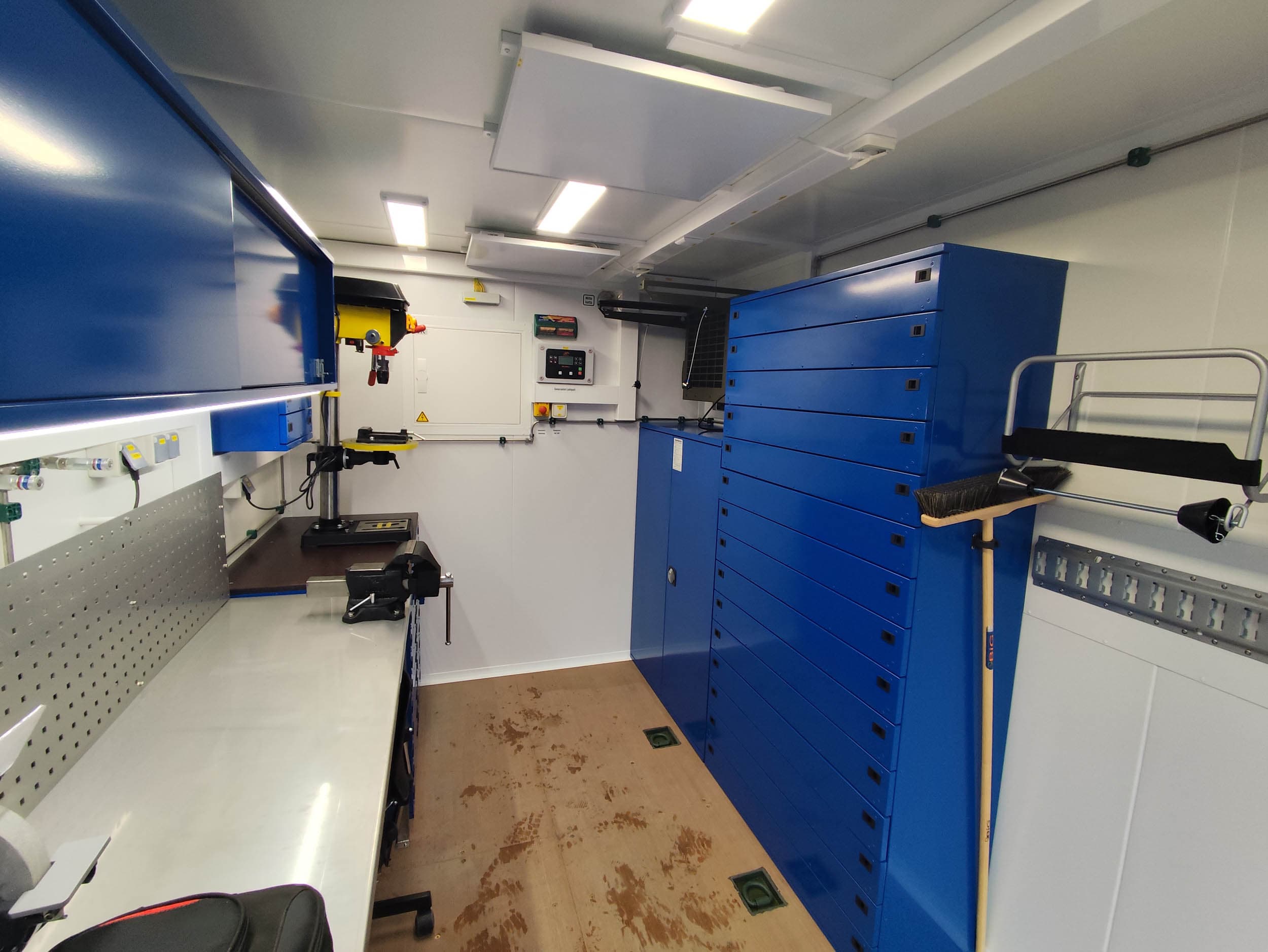 Outfitted according to operational requirements, it can include a variety of integrated installations, precision tools, and machinery. Its optimized layout enables two technicians to work side by side with maximum efficiency and safety.